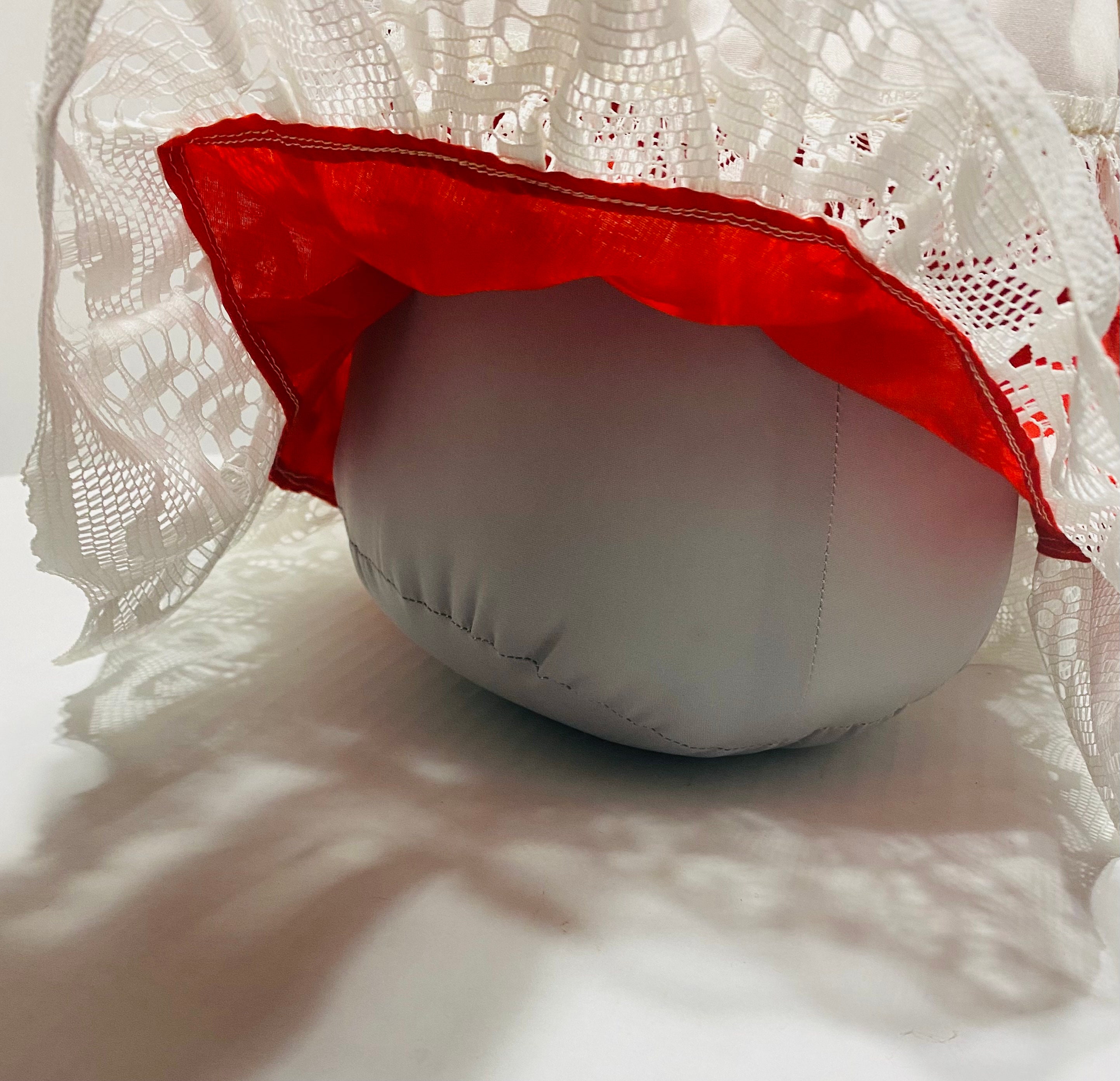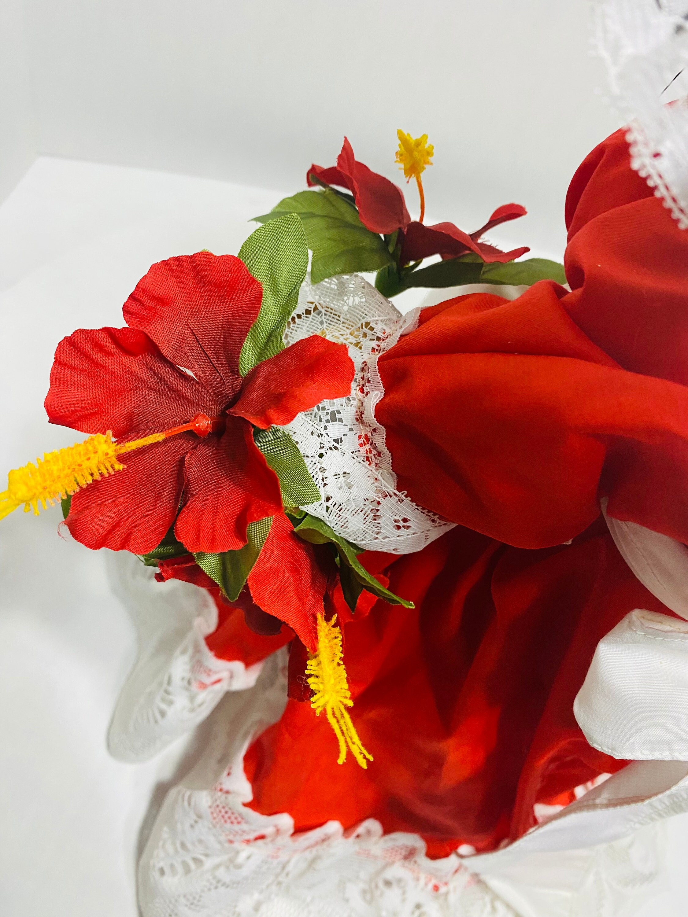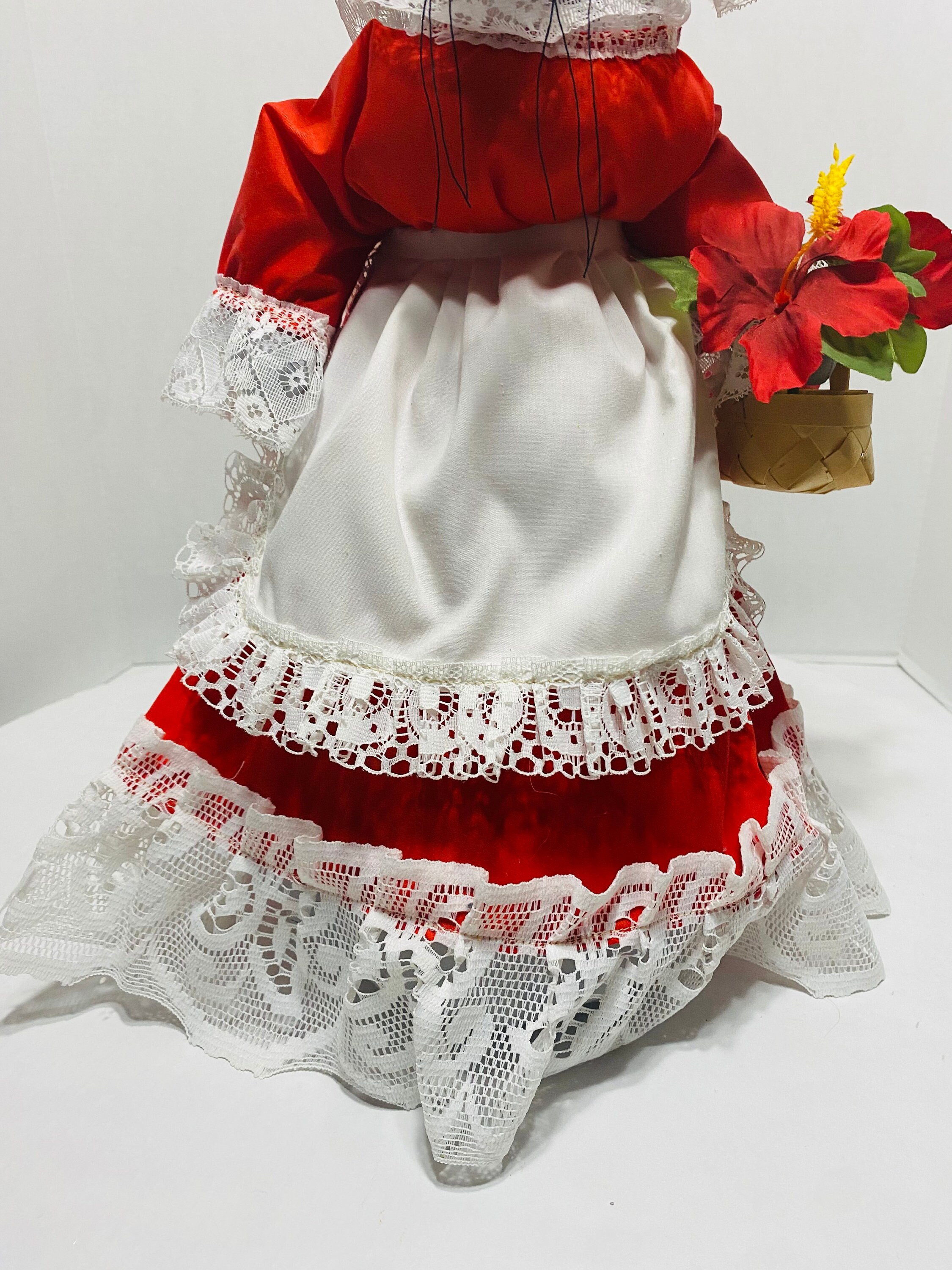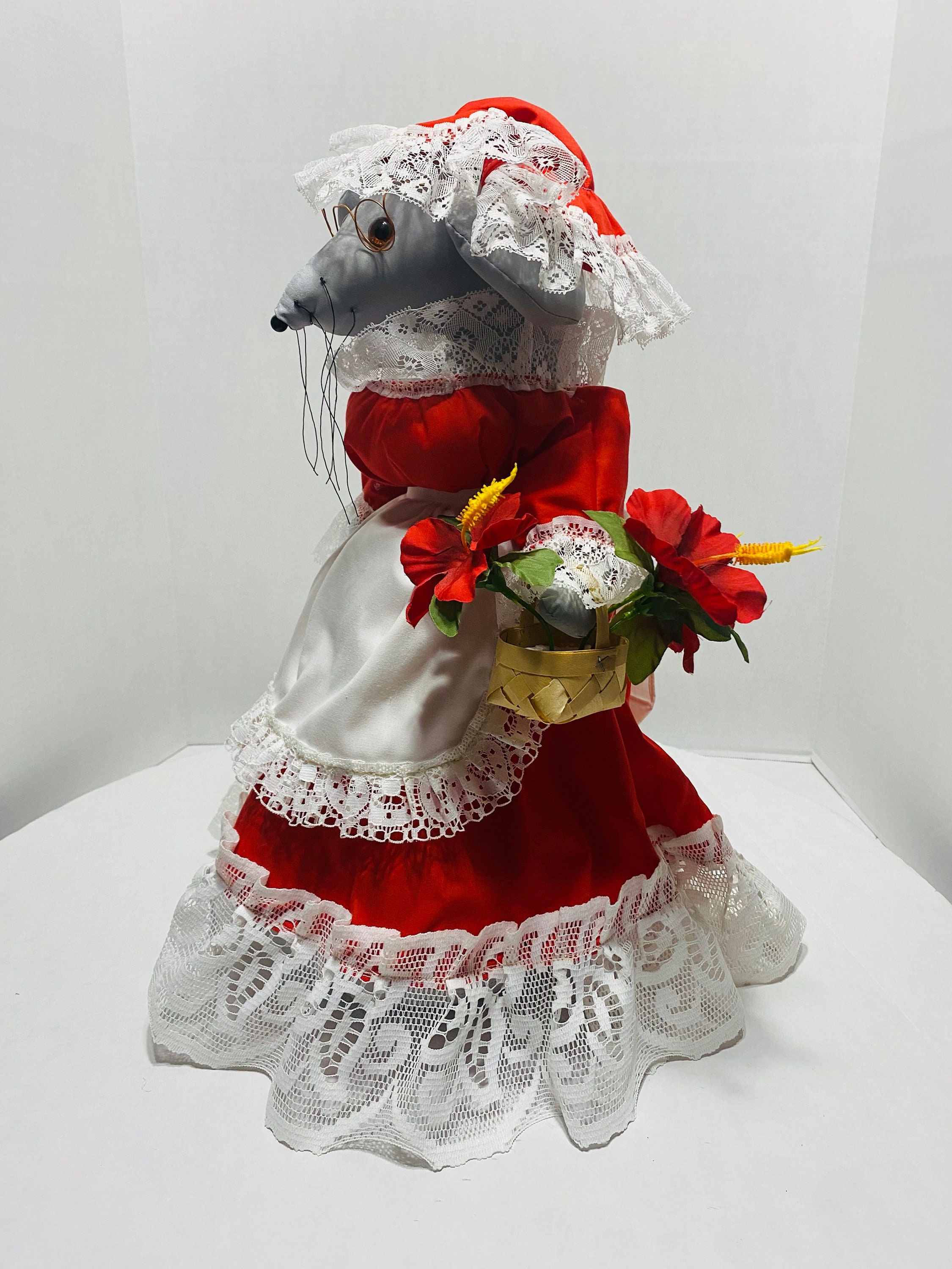 It is 18 inches tall and made of felt. The mouse is wearing a red dress with white lace trim and a white apron. The mouse is holding a basket of red flowers with green leaves.