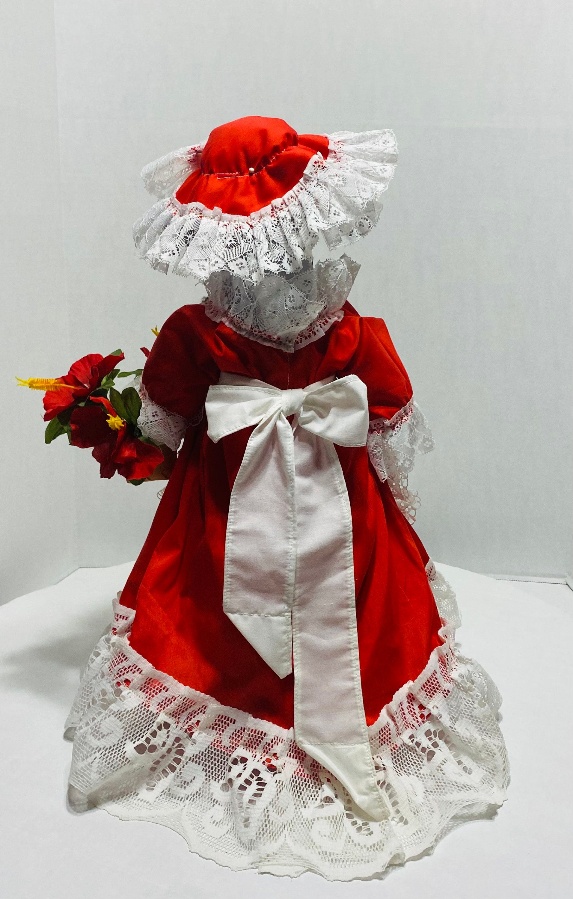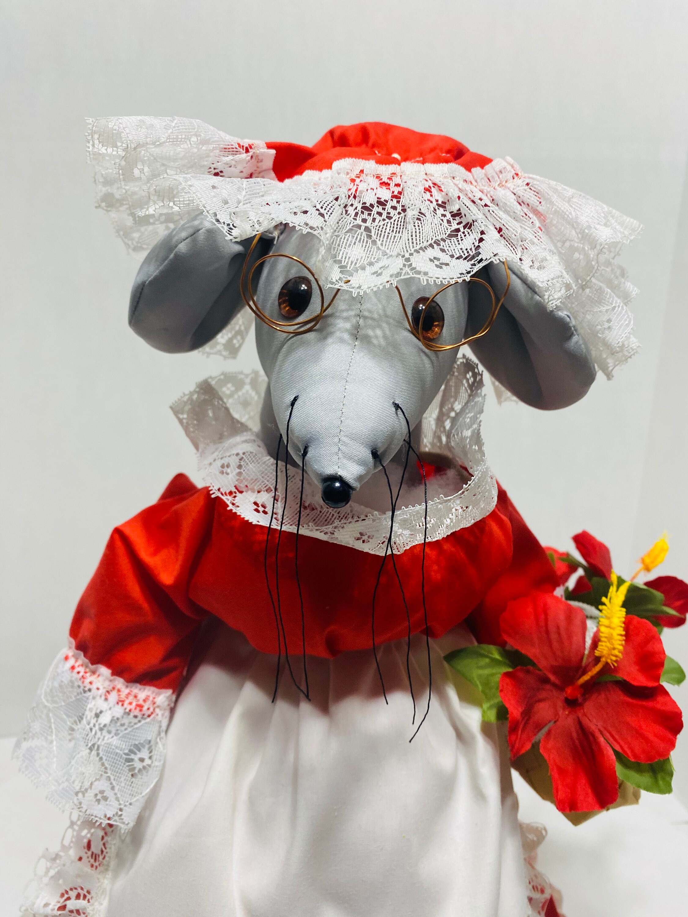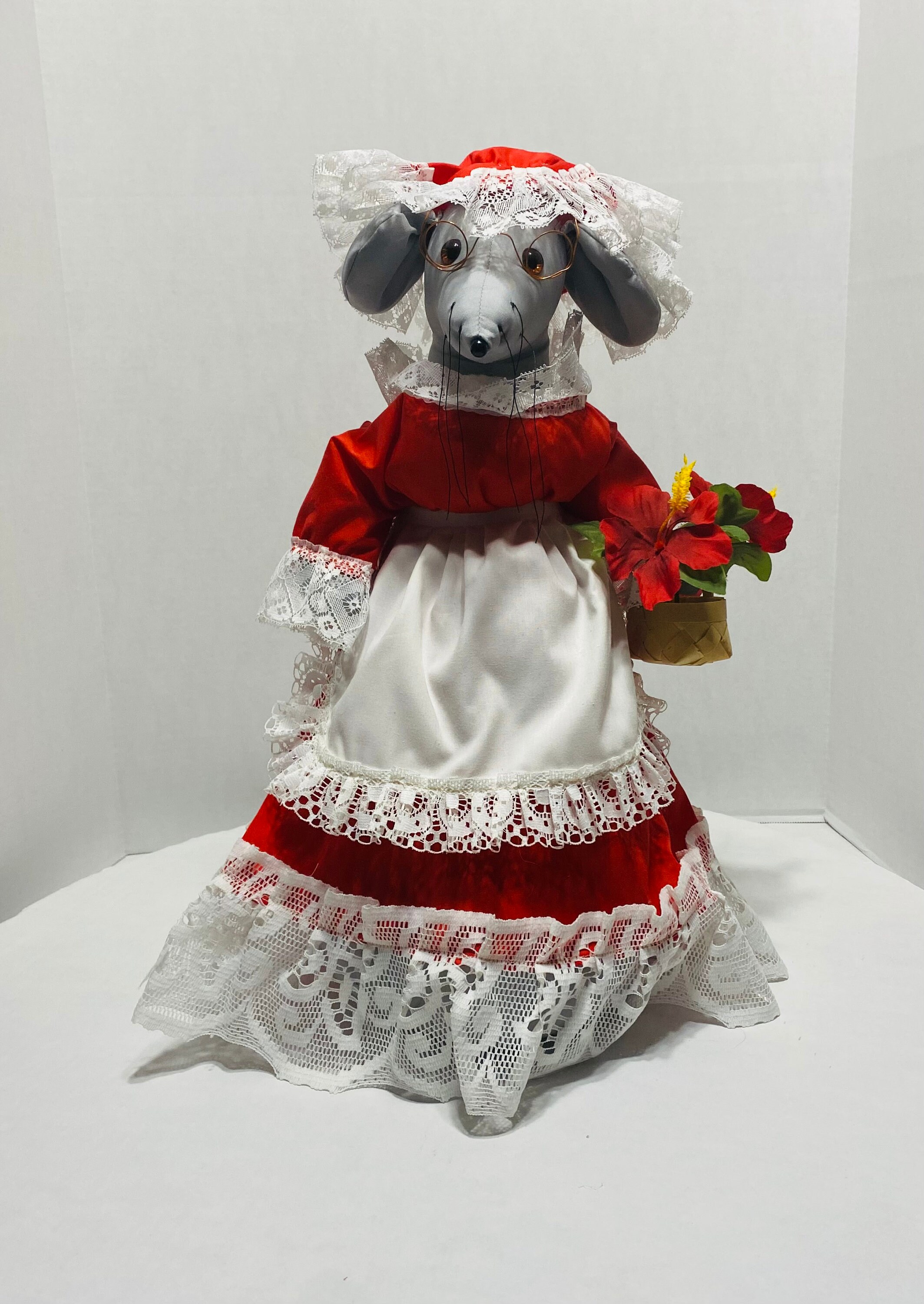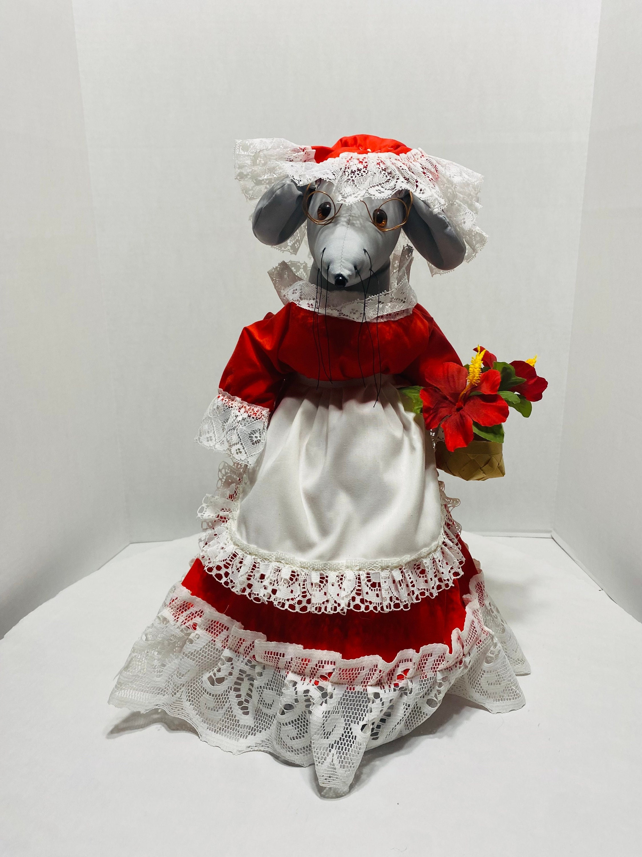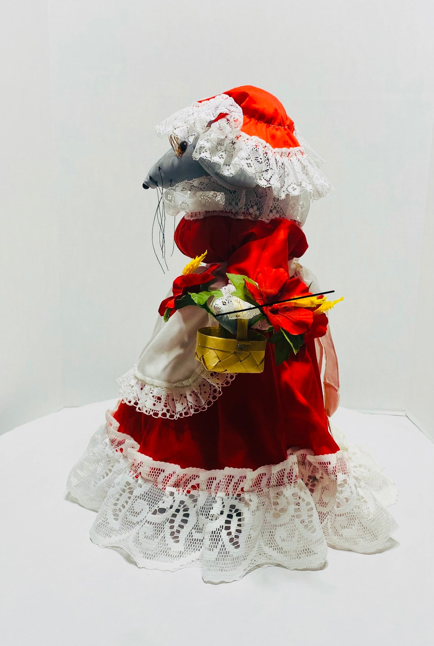 Title: 18" VTG Christmas Grey Grandma Mouse Red Dress Handmade Holding Flowers Basket