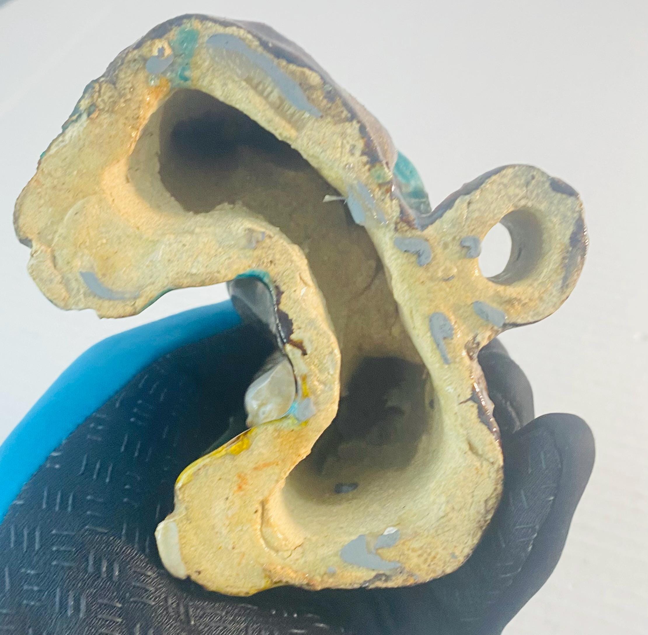 Finish: Glossy glaze in turquoise, ochre, and ivory tones with hand-painted details
